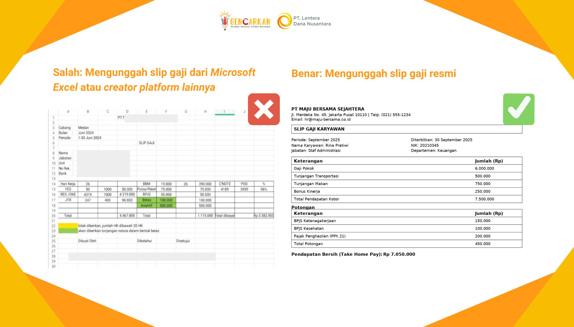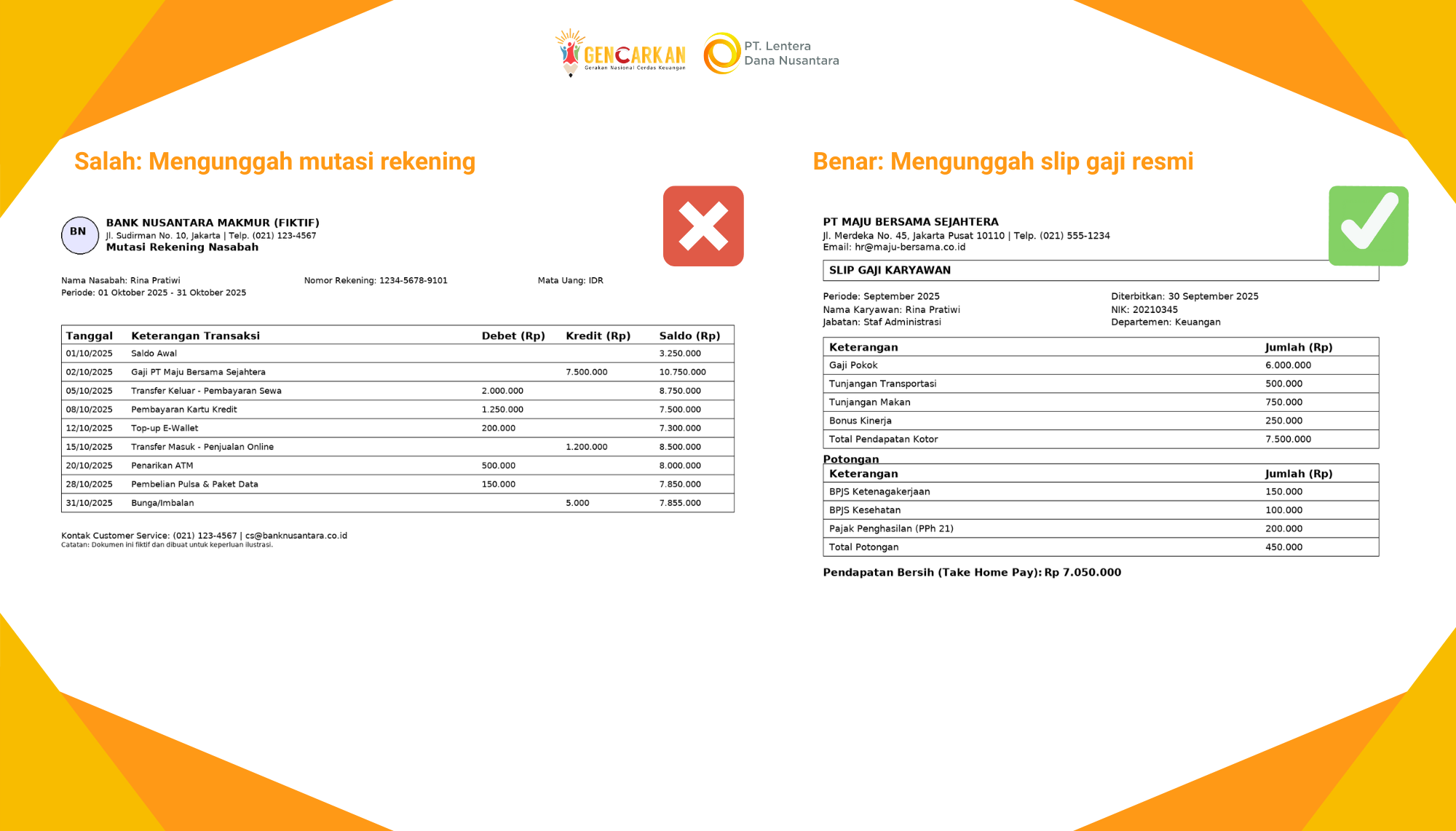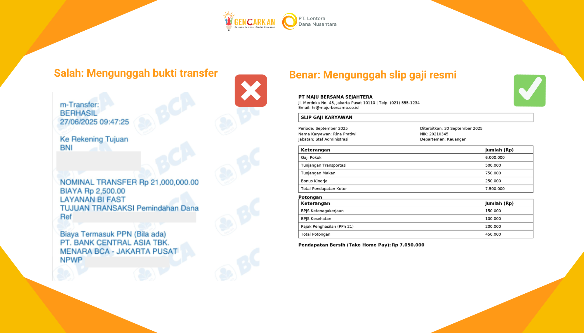 - Pastikan dokumen slip gaji Anda asli, bukan hasil edit atau dibuat oleh Artificial Intelligence