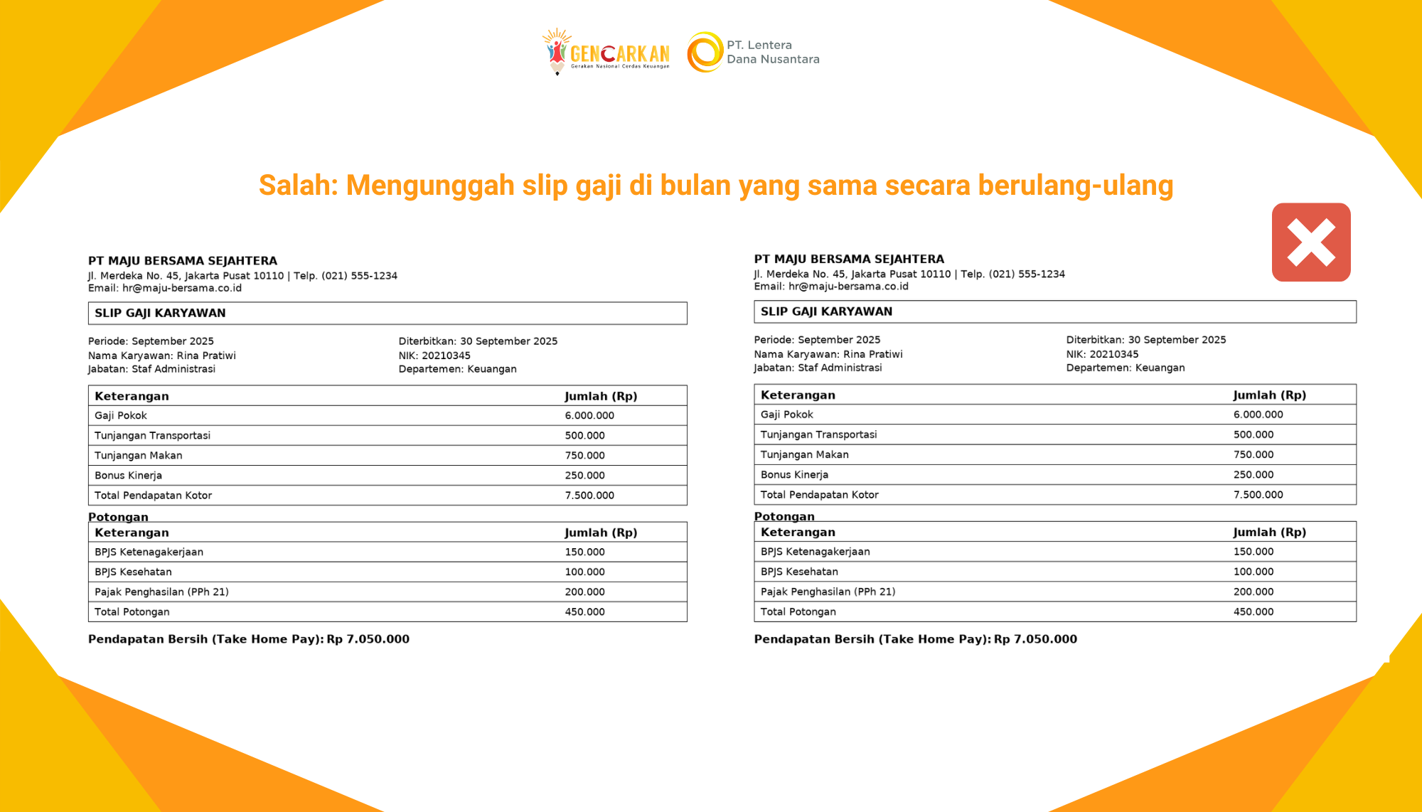 c. Mengunggah slip gaji di bulan yang sama berulang kali tanpa melampirkan slip gaji bulan lain.
